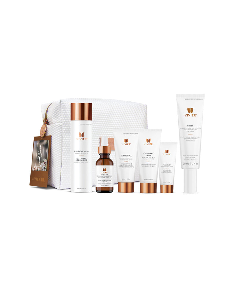 Includes the following full-size products in a Vivier branded vegan leather bag; Medicated Wash, Advanced Skin Lightening Serum, Corrector 2, Exfoliant Forte, Retinol 1.0%, SHEER SPF 45